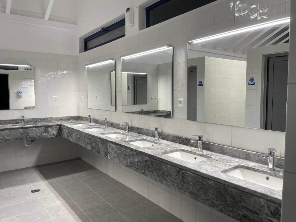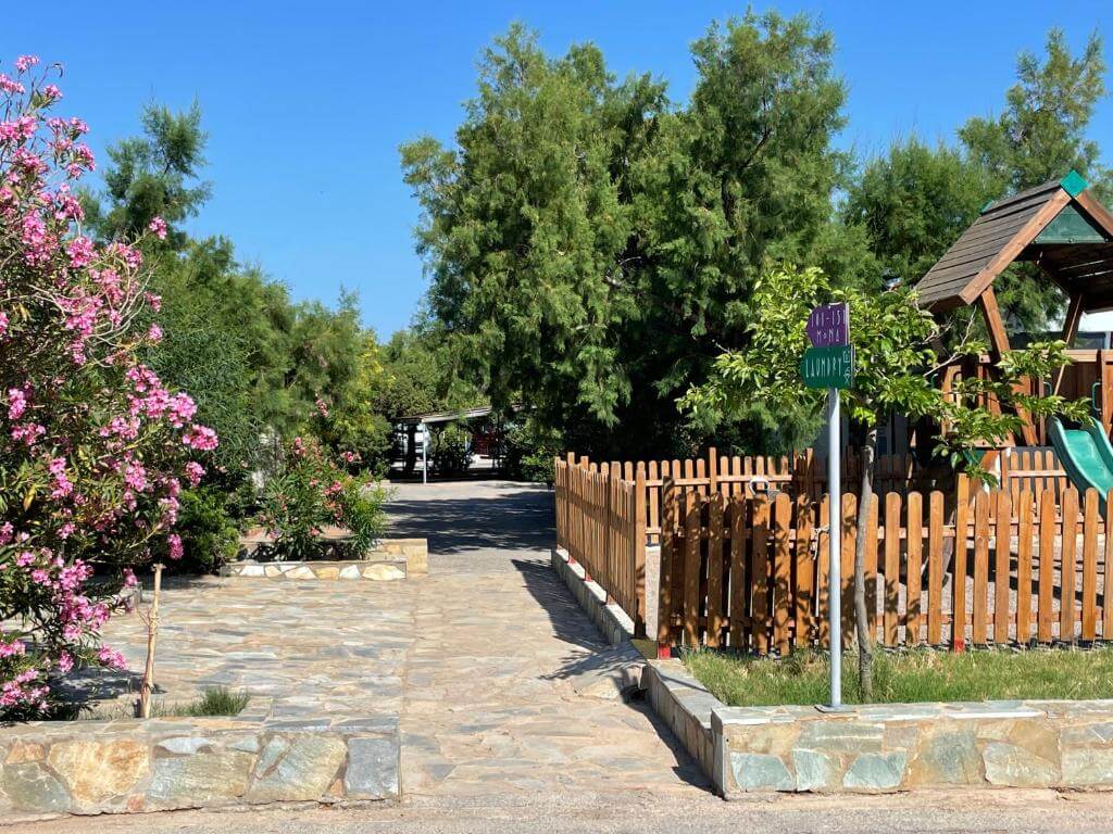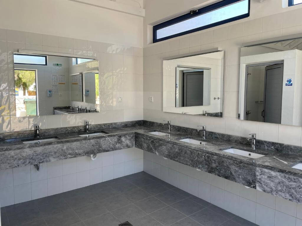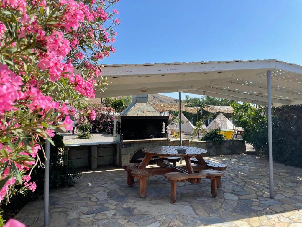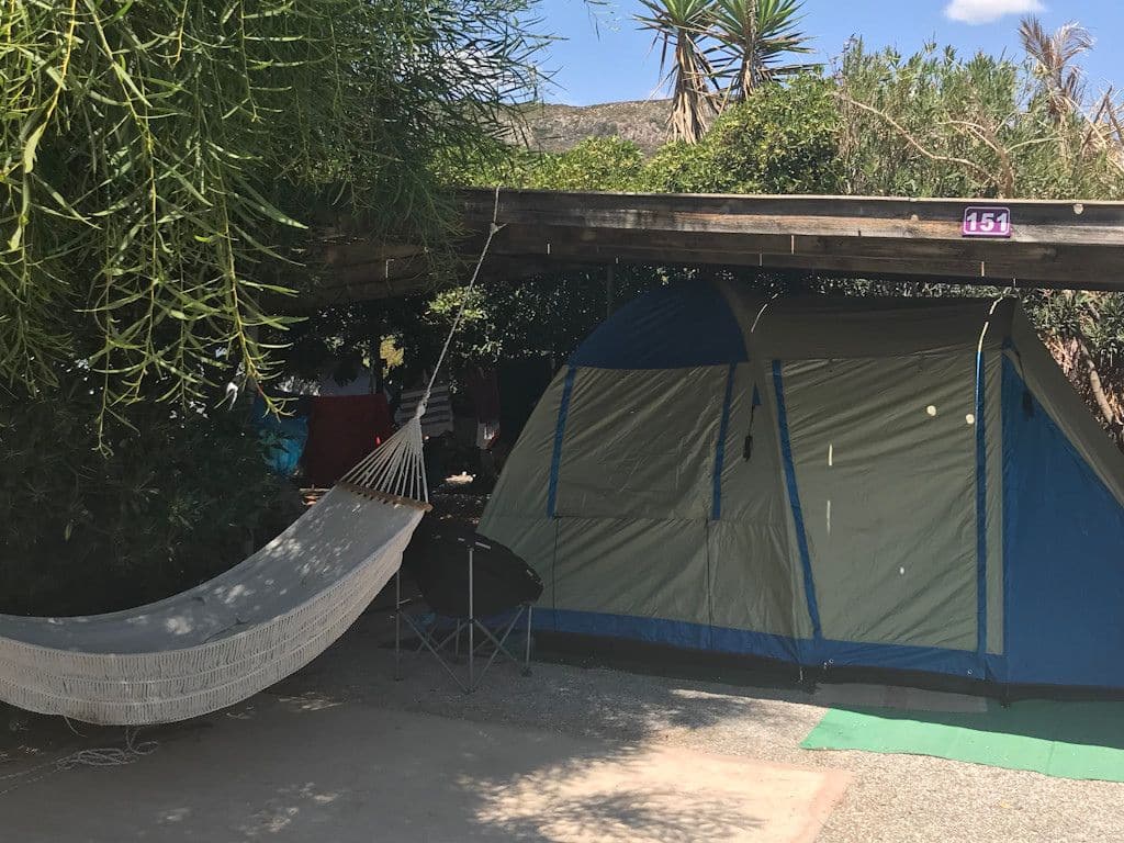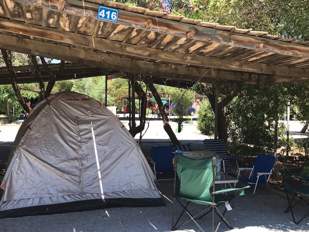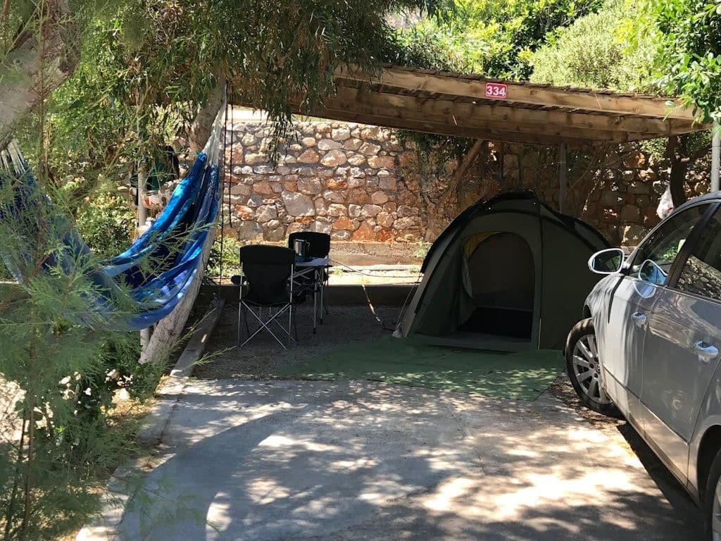 The camping spots in Area B1 can accommodate up to two tents for four people each or one large tent up to 5 meters and have an average height of 1.85 meters. They are equipped with a wooden shade structure for optimal sun protection and are separated by trees and vegetation, offering natural privacy. The ground is covered with gravel, ensuring stability for the tent and camping equipment. Each spot has access to an electricity supply, while a designated parking space for the car is available in front of the tent area.