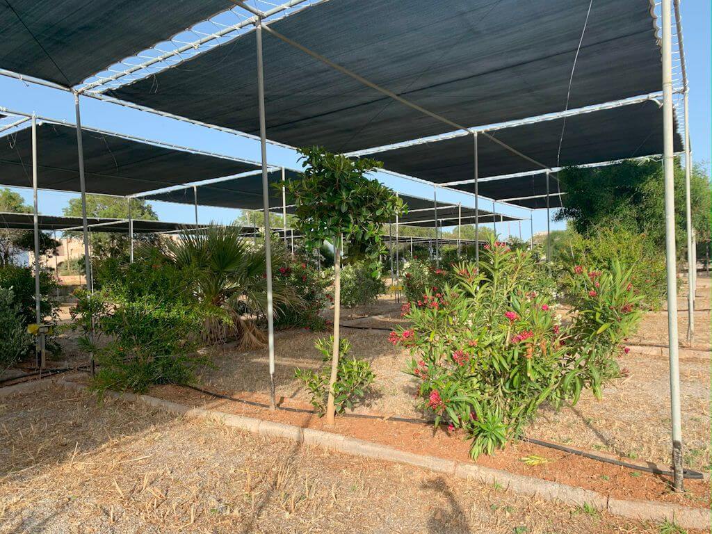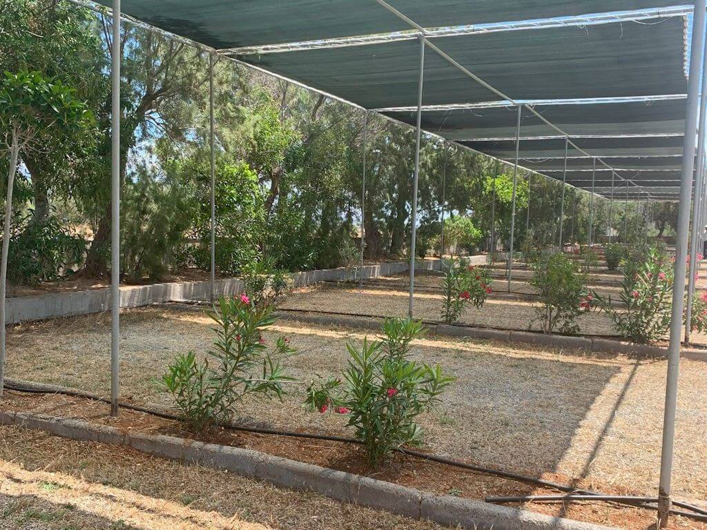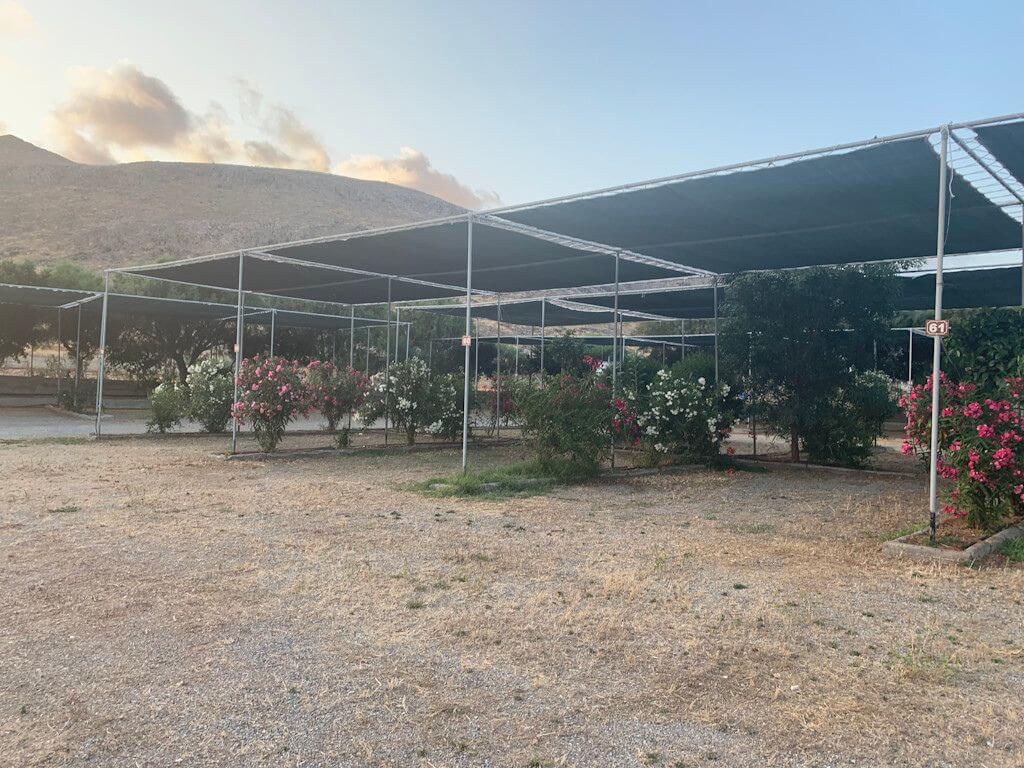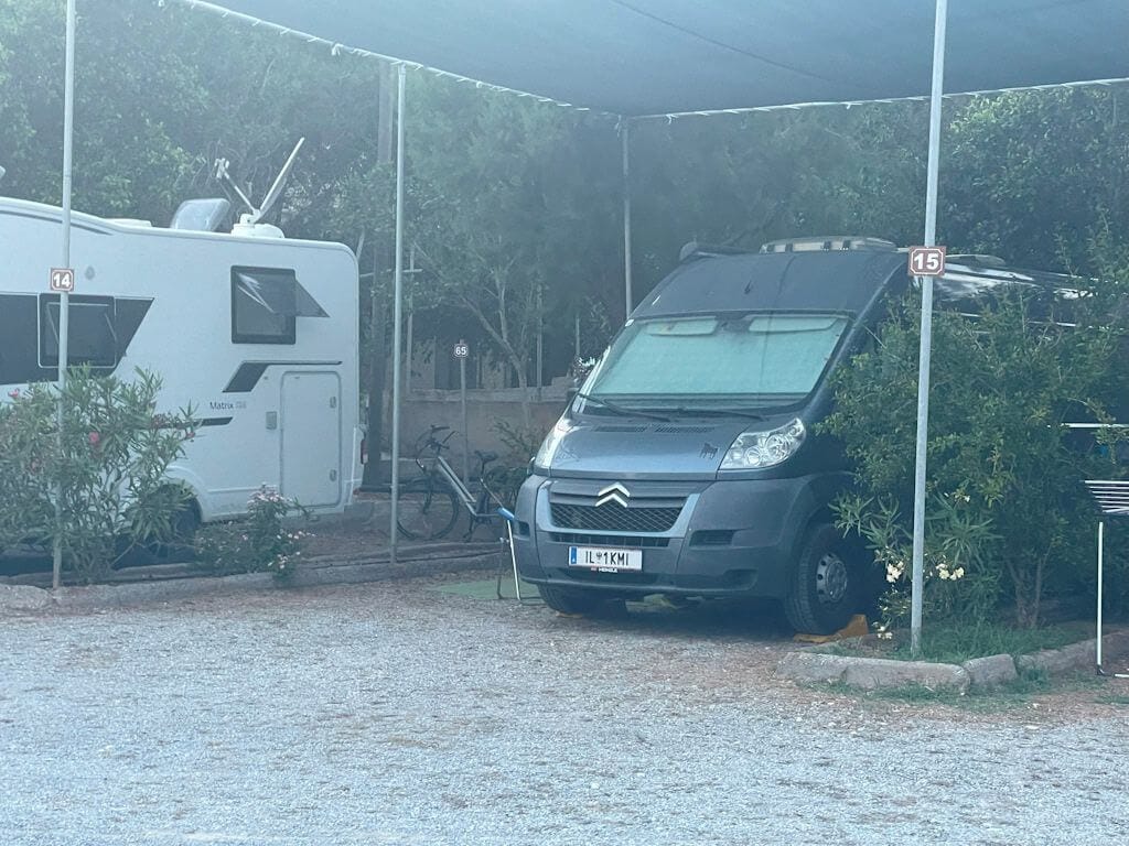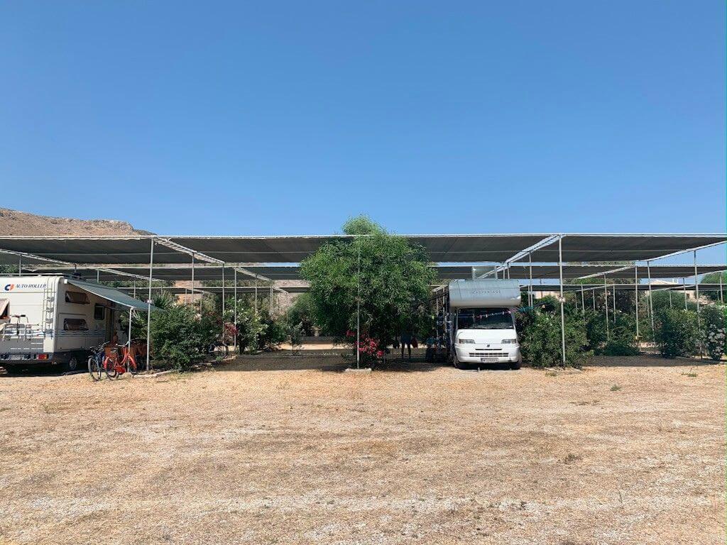 The camping spots in Area C can accommodate up to four tents for four people each or one large tent more than 5 meters and have an average height of 3.5 meters. They are equipped with a fabric shade structure for optimal sun protection and are separated by trees and vegetation, offering natural privacy. The ground is covered with gravel, ensuring stability for the tent and camping equipment. Each spot has access to an electricity supply, while the car can be parked directly in front of the tent area.